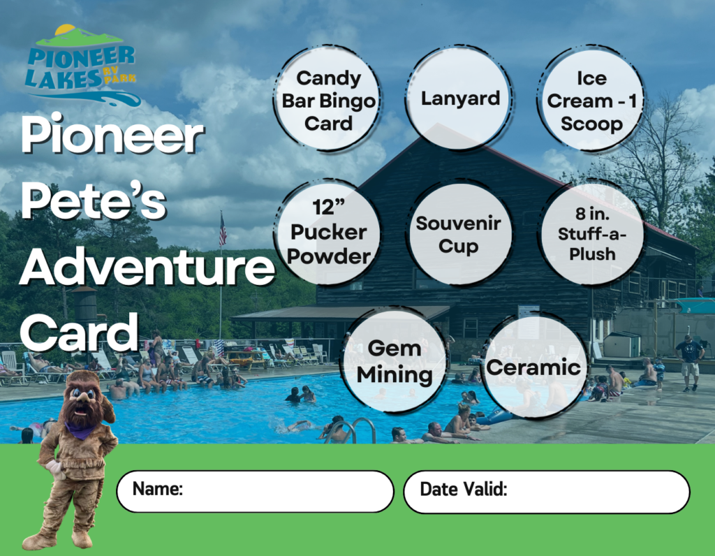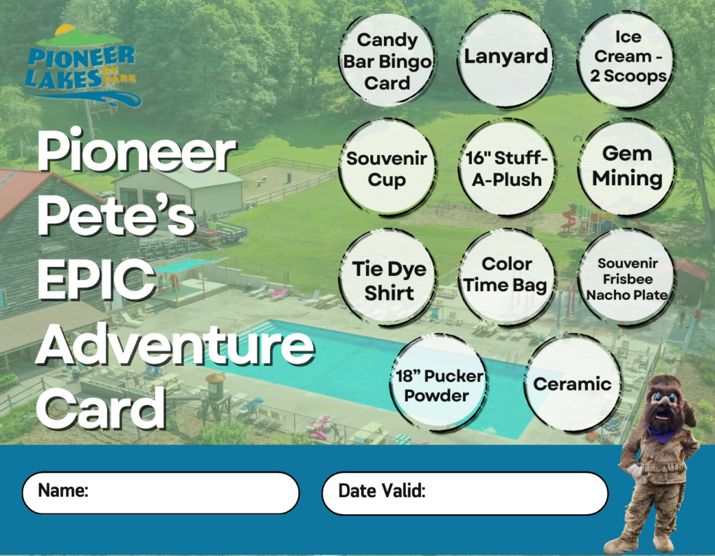 What’s Included?  Enjoy classic camp fun at Pioneer Lakes RV Park! Call BINGO with a free Candy Bar Bingo card, cool off with one scoop of ice cream, and pucker up with a 12” Pucker Powder. Sip your favorite drink from a 32-oz souvenir cup, then create your own cuddly 8” Stuff-A-Plush. Dig for hidden treasures with Gem Mining and craft a keepsake ceramic figurine to remember the fun. Finish it off by grabbing a Pioneer Lakes RV Park lanyard—the perfect way to take the memories home!