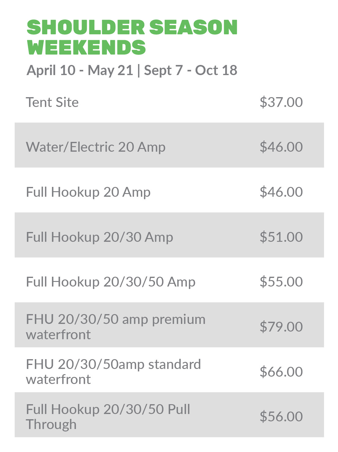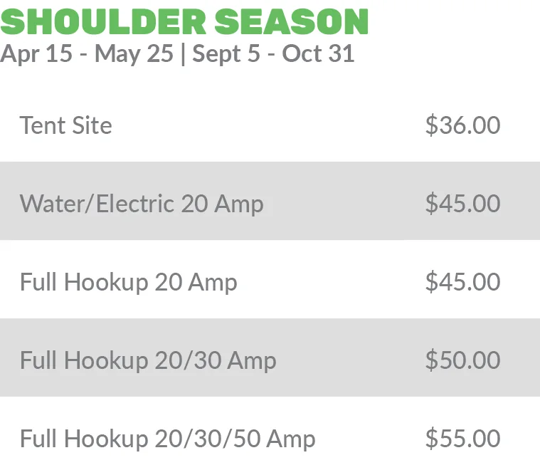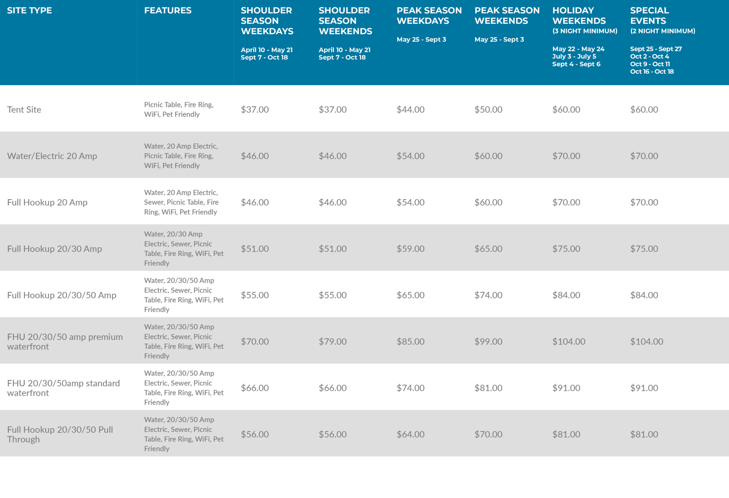 - Holding tank disposal service: $10 for campers without sewer on site.