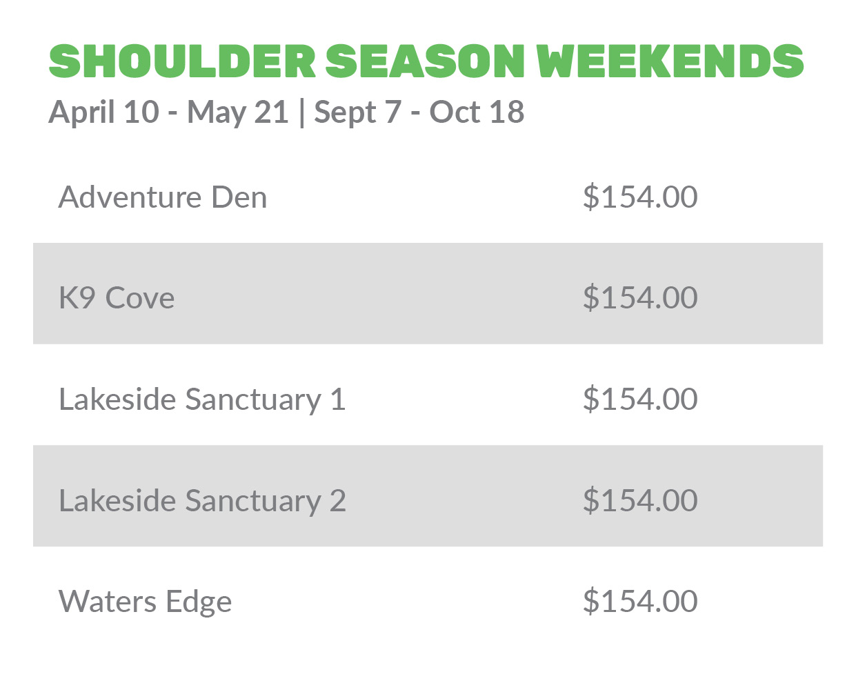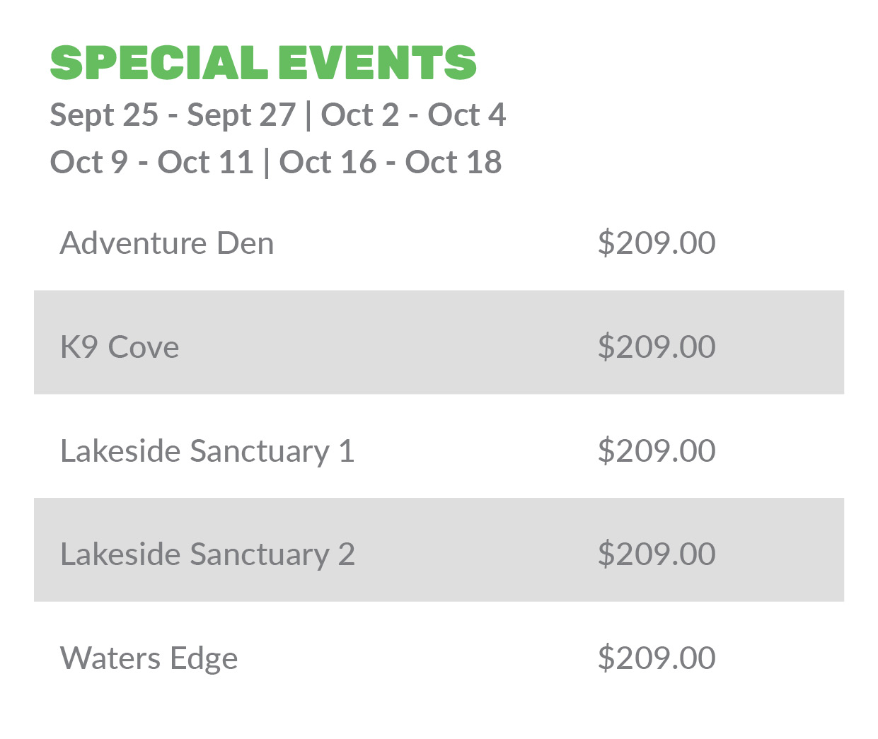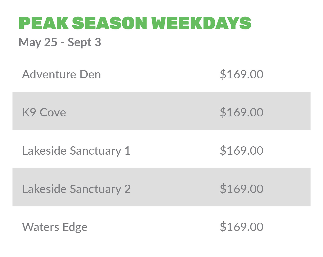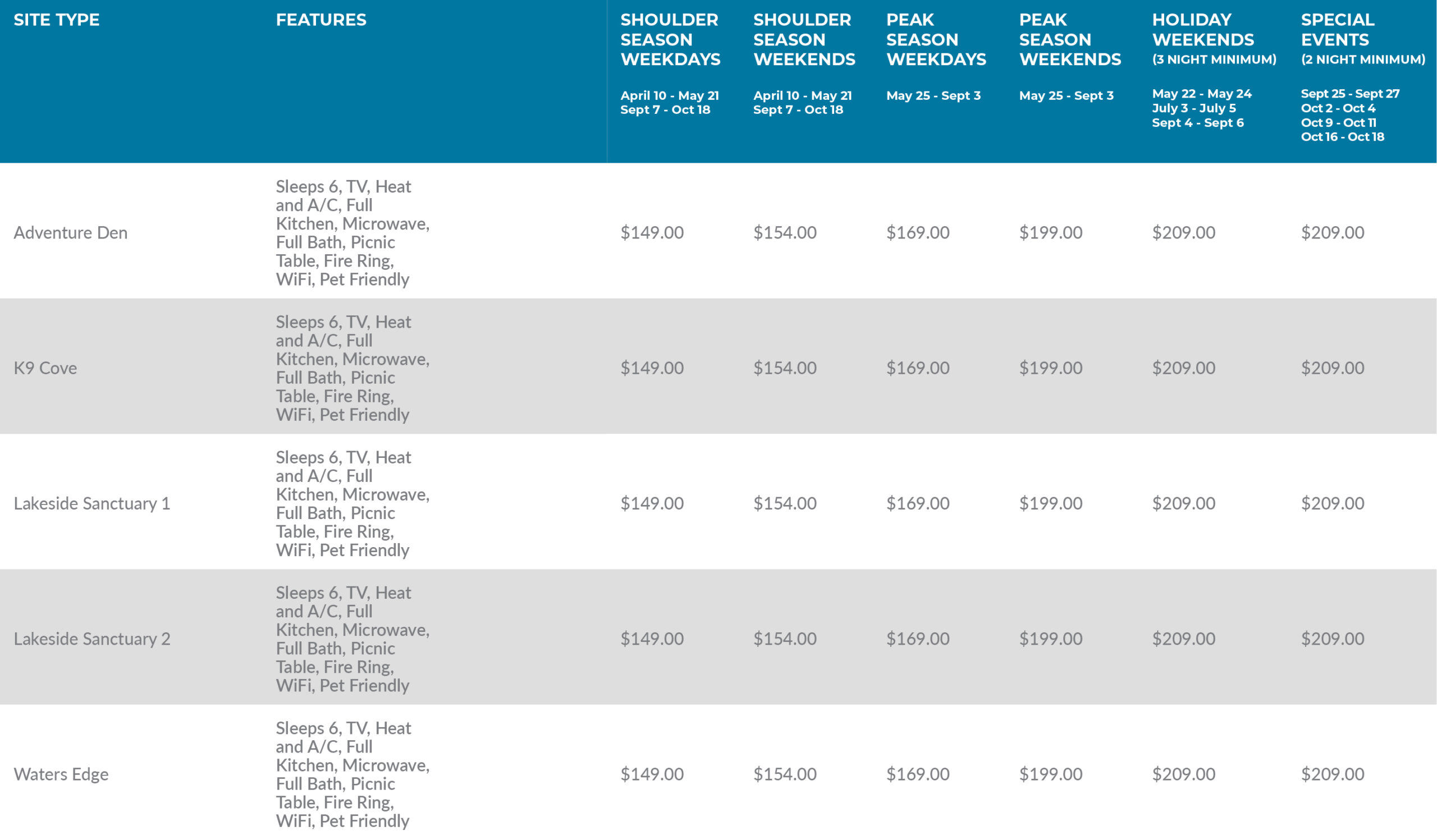 * 2-night minimum for cabin rentals, 3-night minimum for holidays.